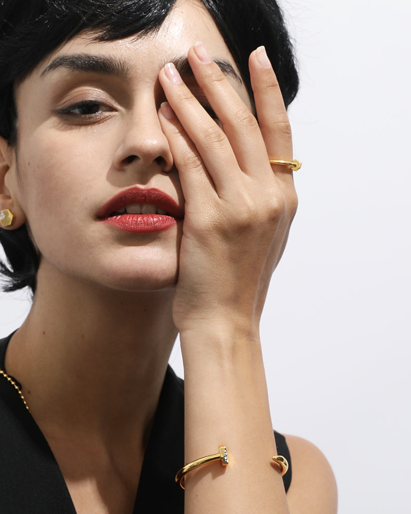 Showing your strength and confidence has never been more glamorous with unique effortless yet contemporary jewelry. This eroded nail bangle bracelet features crystals in a decadent ripped effect in rugged terrain of rich gold, an ode to those who dare to reveal their true self.