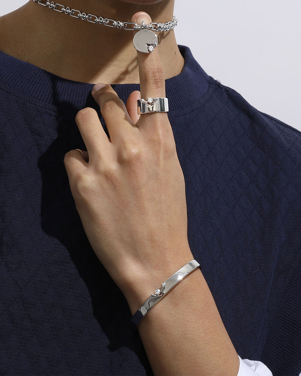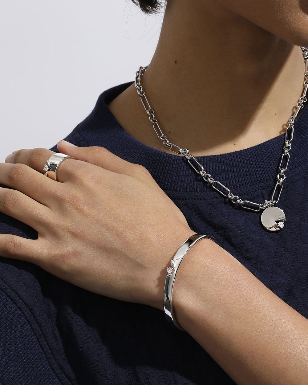 Break the boundaries. Fused with the rip on its edge,this cuff bracelet features bright crystal symbolising a shine with strength and power. For her, and for us. It is designed with the modern minimalist in mind for everyone.