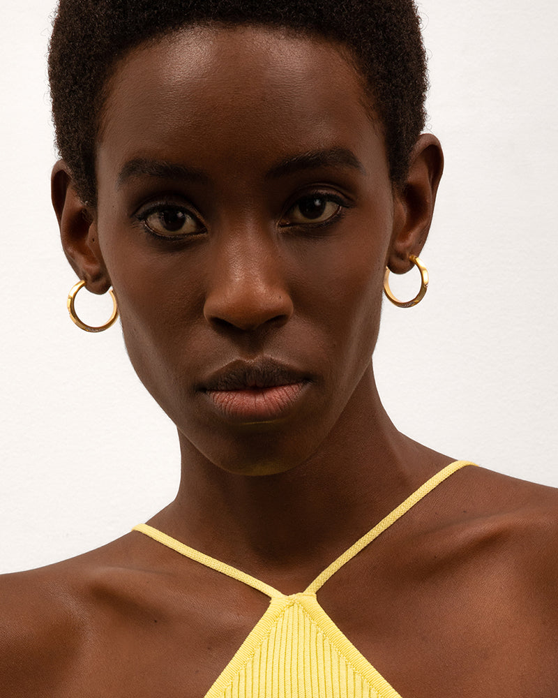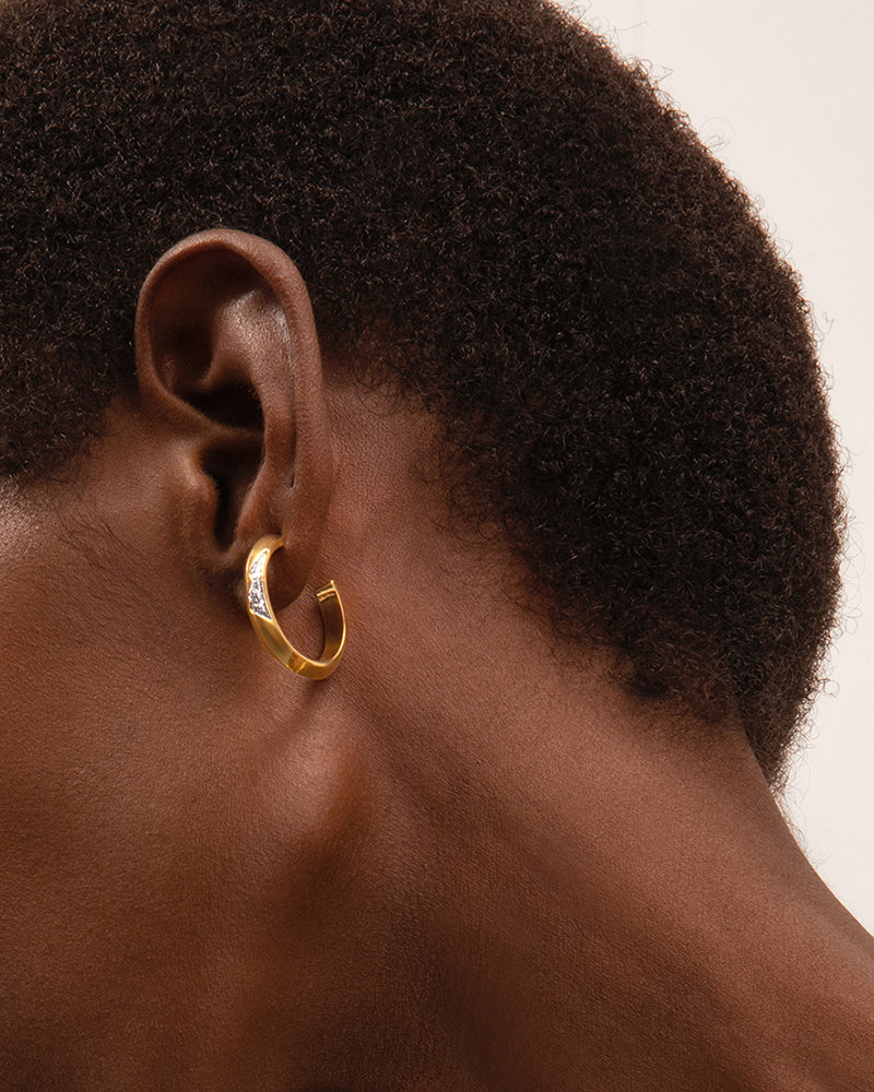 These geometric eroded hoop earrings elevate any look with a casual and cool style, revealing a two-tone effect with a striking subversive-basic design. Clean silhouettes and rugged detailing give these hoops a classic meets contemporary fusion.