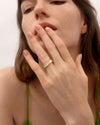 Two titled rectangular crystals are added to the row of well-regulated rectangles on the opposite side, breaking the rule and vitalizing the ring. All the time, the irregular shape on your finger will bring you the bravery to behave yourself and stand out in a crowd. This stylish item provides multiple cool looks from different angles and enables you to diversify your looks with creative stacks.