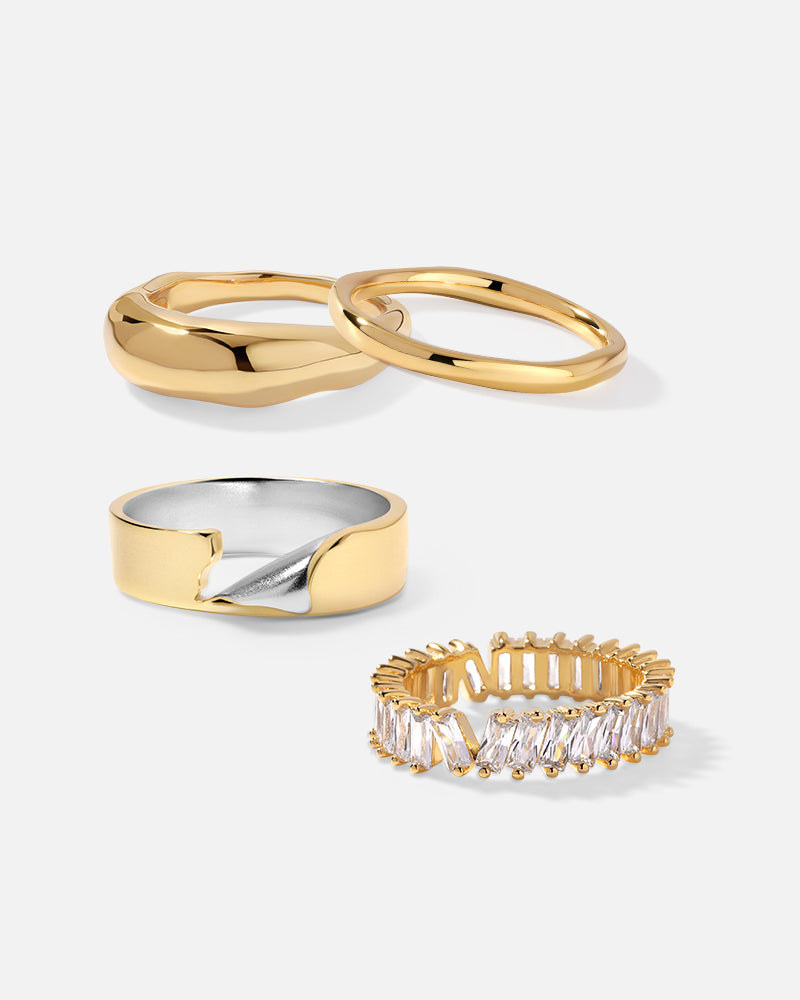 Torn Wide Band Ring Set of 4 in Two-tone Gold Vermeil and Sterling Silver, Crystal