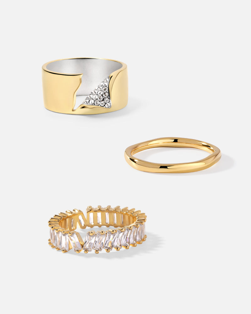 Torn Wide Band Ring Set of 3 in Two-tone Gold Vermeil and Sterling Silver, Crystal