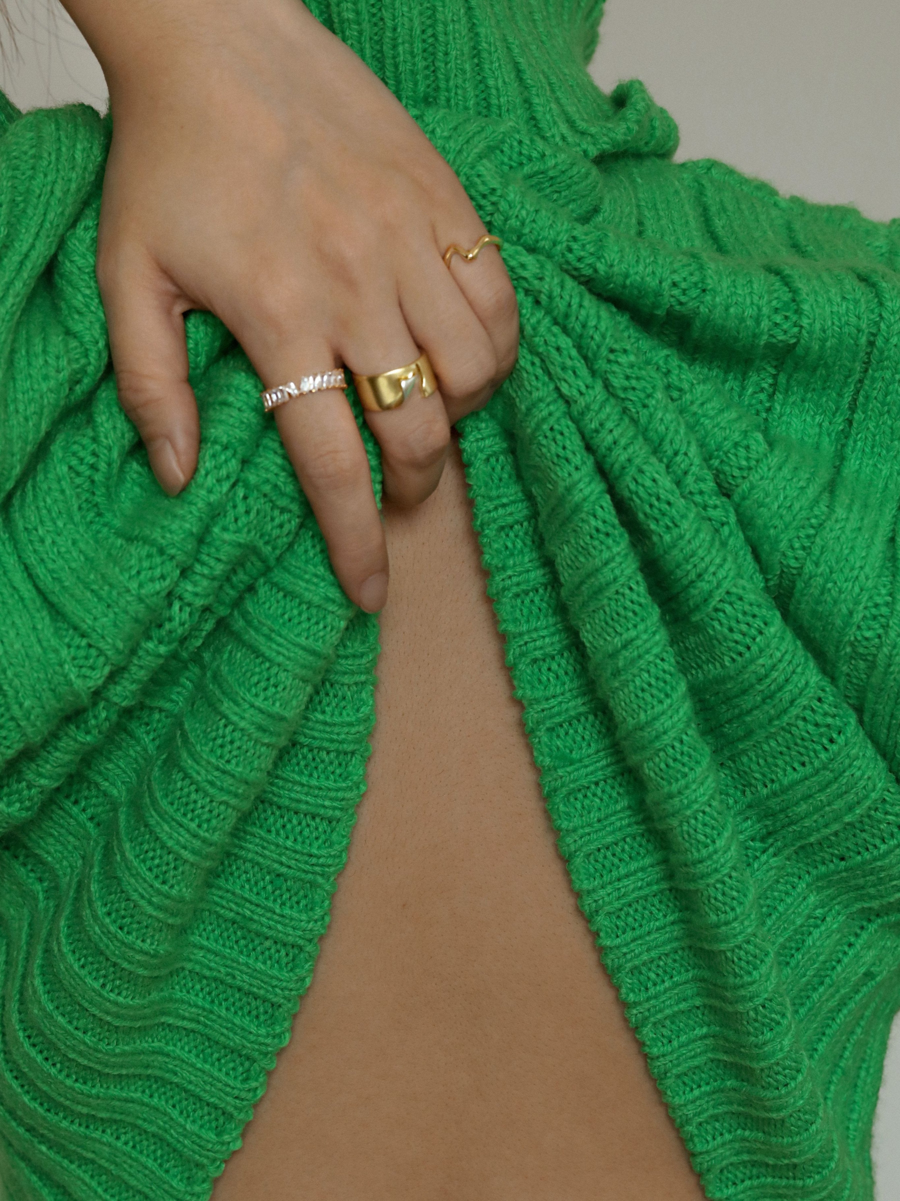 A perfect harmony of elegance and bravery in the stack, added with the eternity ring and the wavy ring.